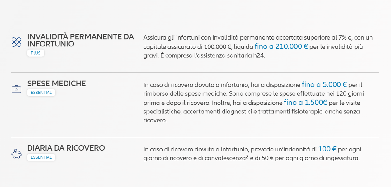 1 Configurazioni a titolo puramente esemplificativo: prezzi comprensivi di imposte, durata minima 12 mesi. Le prestazioni possono prevedere franchigie e scoperti in caso di sinistro, limitazioni ed esclusioni.
